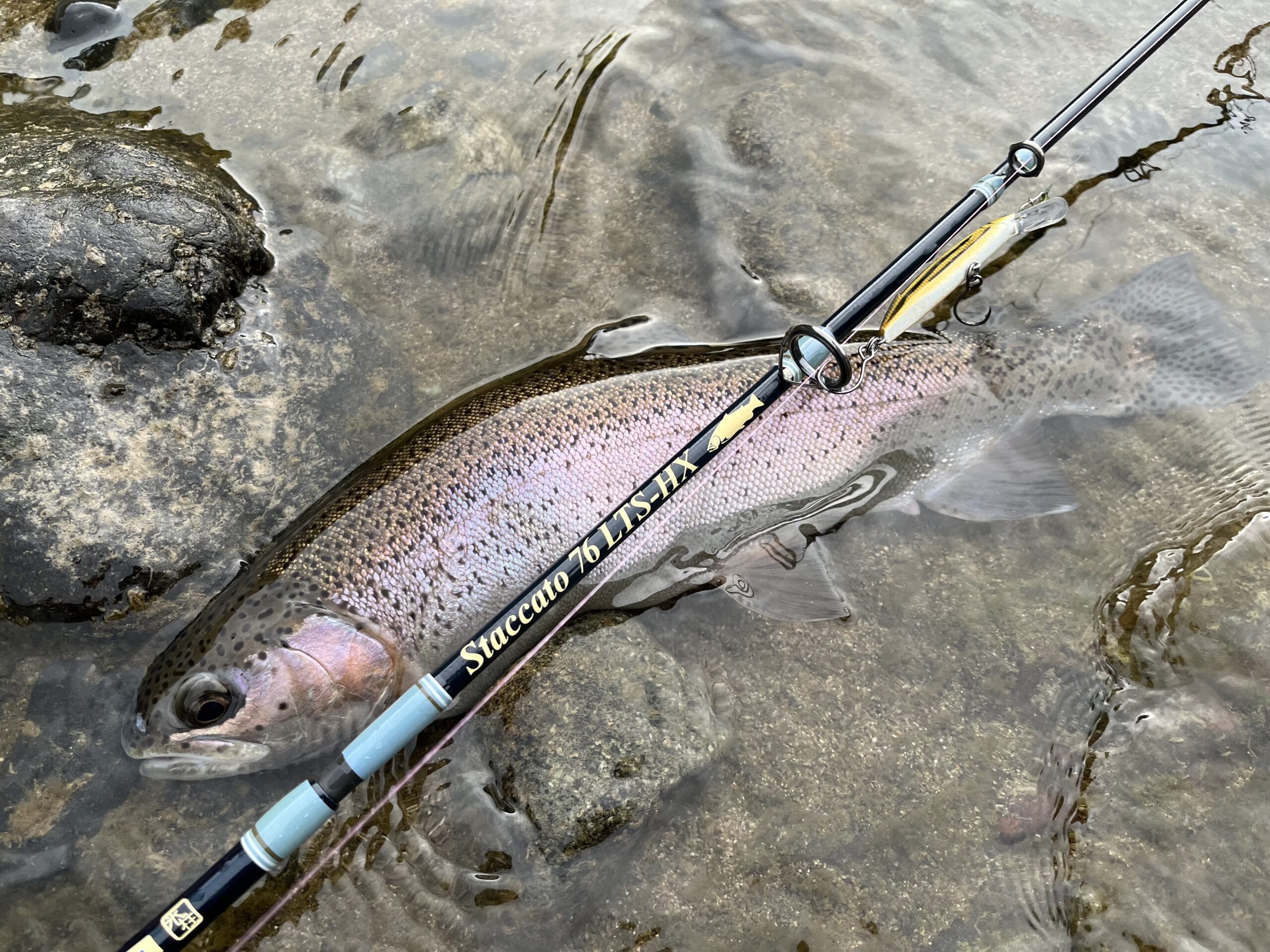 巻いていたミノーにガッツリバイトし幸先よく銀ピカのレインボーがヒットしてくれました。