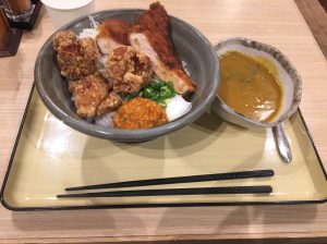 唐揚げ、カツ、カレーと好物が全部乗ってます。