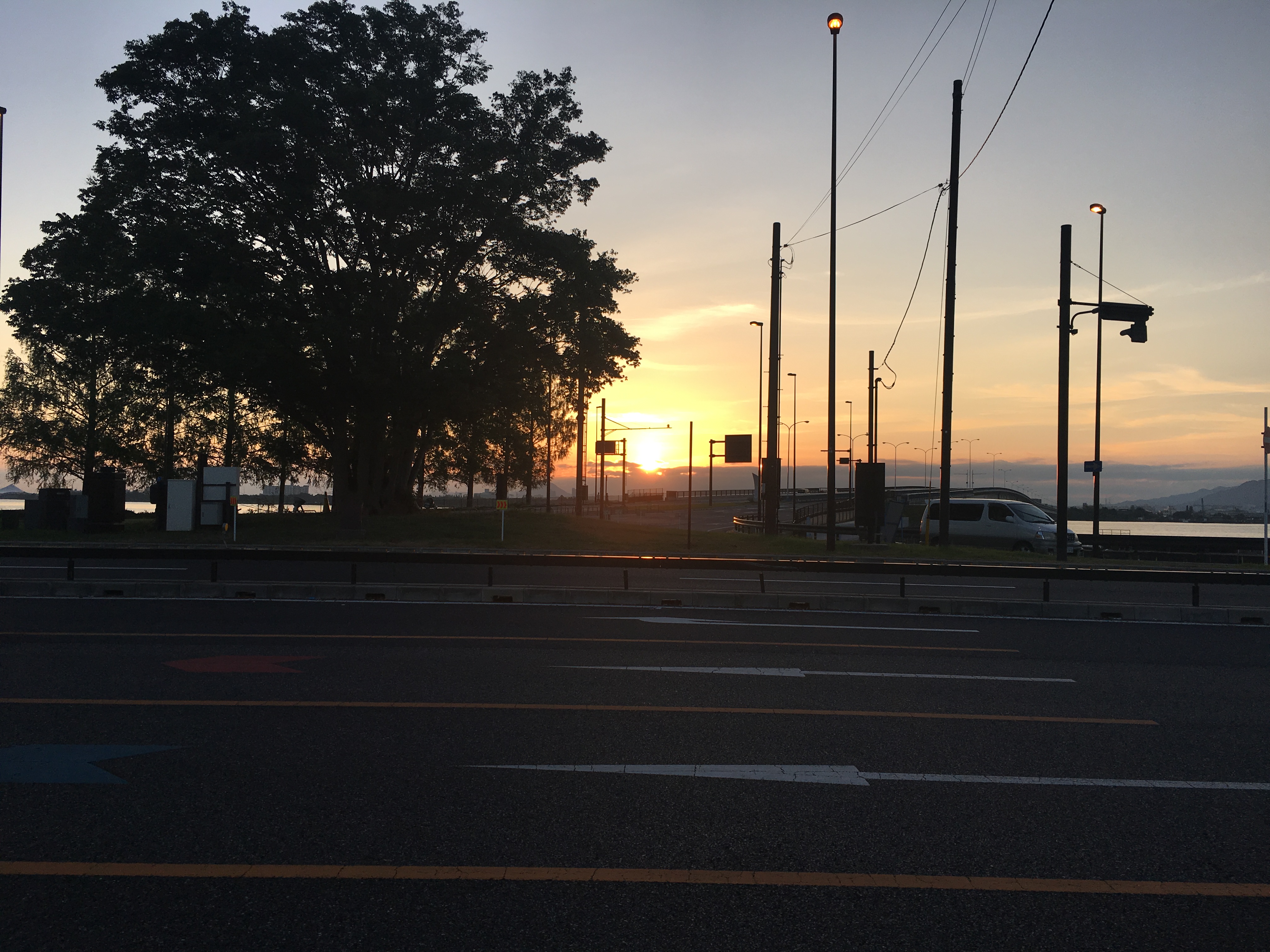 朝日が眩しい。