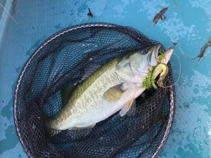 「もう少し風吹けばいいな〜」と思いながら去年スイムジグで釣ったウィードエリアで粘ります。
