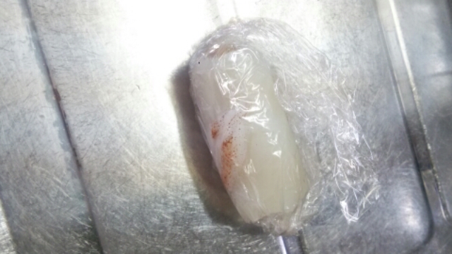 水で洗って塩を落とし、イカの胴体でくるみます。