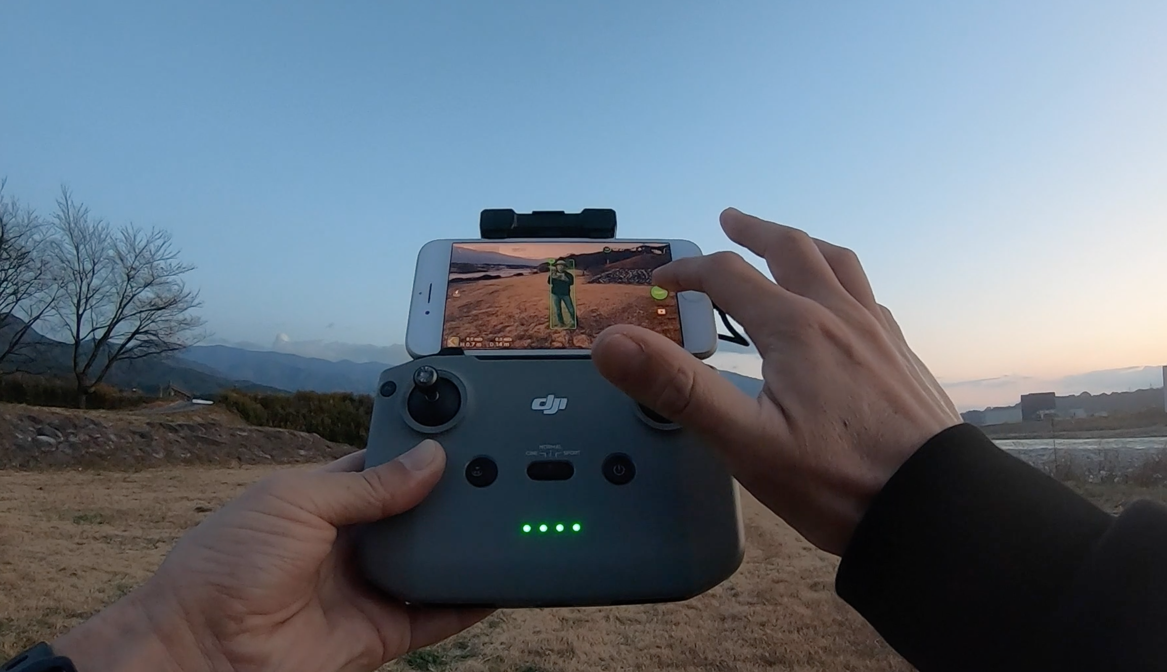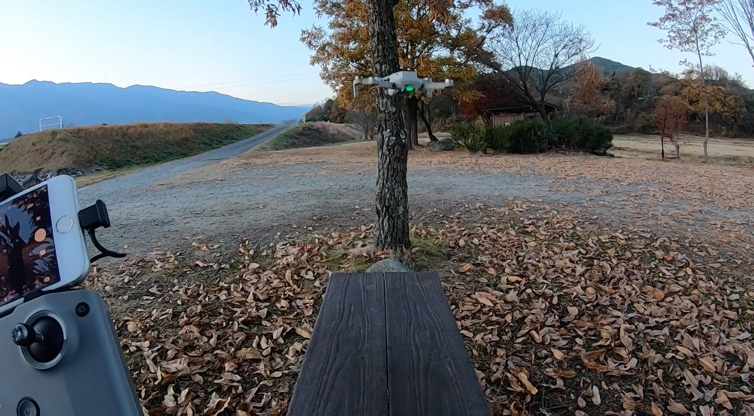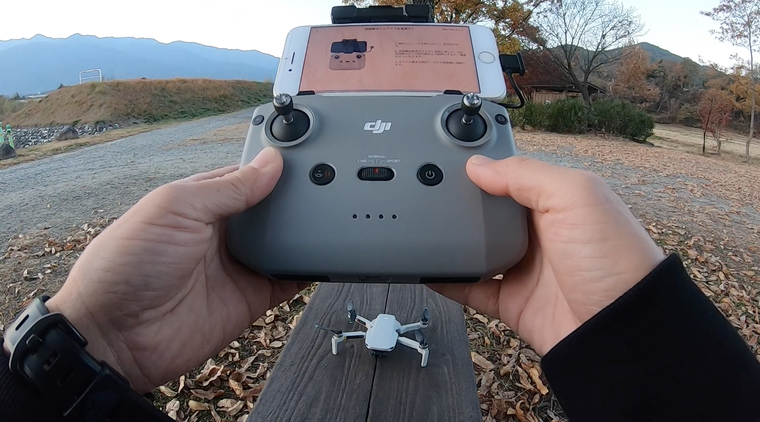 あらかじめDJIアプリを入れてコントローラーとスマホを繋げばあっという間に飛び立ちます。