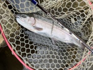 若干心が折れかけたところ、足元がギラっと光ったと思ったら激しくロッドが入りこの日1番のサイズが!