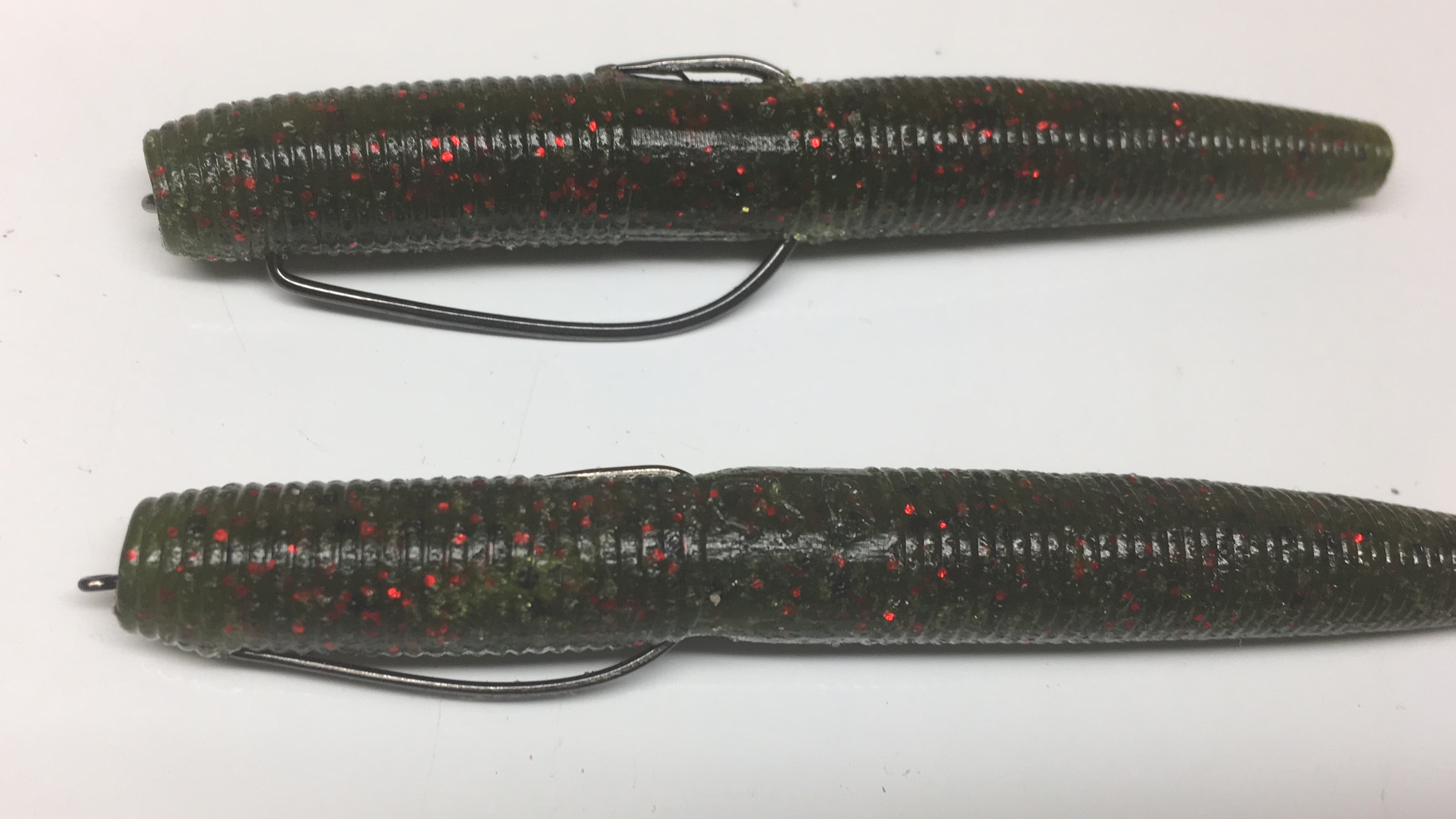 写真の下のようにフックをセットするとワームがズレにくく針先が出にくいので