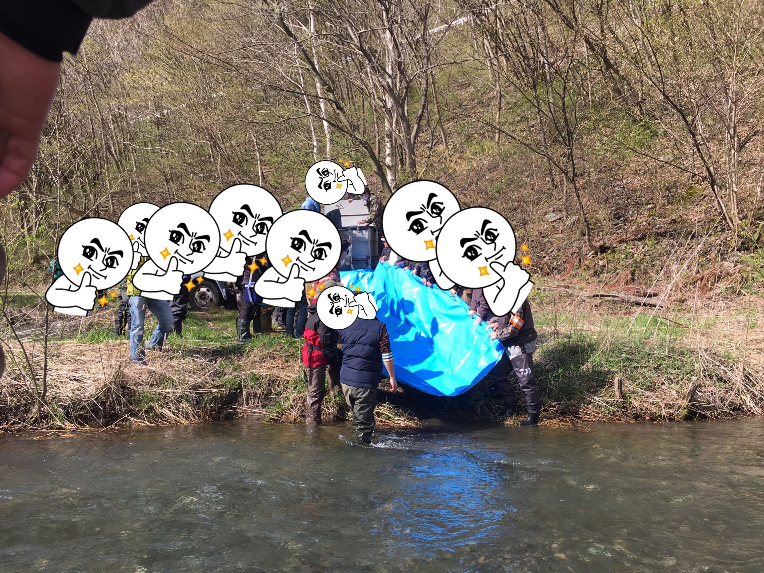 放流直後は正にそうですが、放流場所の付近や上下流、橋から覗いたりして魚の有無を