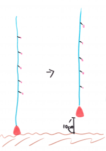 上のようにエサをつけたら、仕掛けを一度底まで落として少し持ち上げる(10cmくらい)。